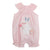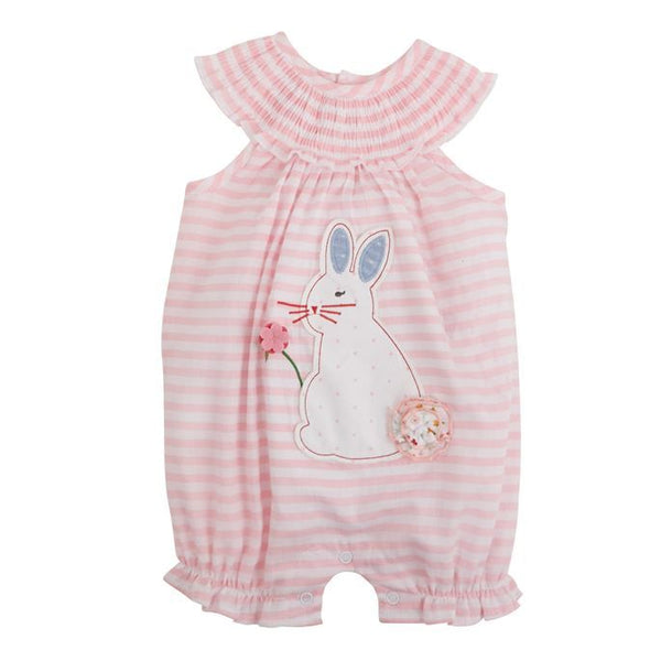 Smocked woven cotton twill bubble features gathered leg openings and cotton interlock polka dot bunny applique with felt flower and dimensional ruffle floral tail. Inner leg snap closure and back button placket.