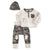 3-piece set. Yarn dyed cotton interlock top with camo neckline, pocket and front snap placket arrives with camo cotton ribbed pants with contrasting knee patches, twill tape faux drawstring at waistband and cuffs and coordinating cap.