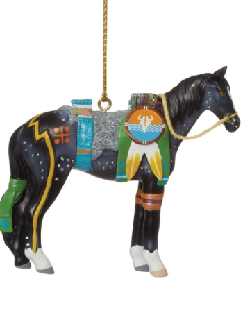 This spotted stallion is adorned with brightly colored reverence. Paying ode to native American traditions, this striking steed is fitted for war. With magic in its blood, this Painted Pony ornament beguiles with intense hue and enchanting symbols.