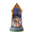Jim Shores Holy Family figurine grace the front of the Three Kings' midnight ride in backdrop. Features a battery-operated rotating base to reveal Angles and Shepard's depicted on the other side. The lit interior scene illuminates the timeless story.