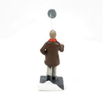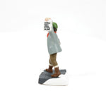 This Set of 3 depicts: Woman with Groceries: A woman, warmly dressed in a red coat with fur trim, walks home with bags of groceries, embodying the simple pleasures of holiday preparations. Paper Boy: An enthusiastic paper boy, dressed in vintage attire, calls out the latest news while holding a newspaper, bringing a lively touch to the city streets. Man with Flying Hat: A gentleman, caught in a gust of wind, tries to catch his hat as it flies off, adding a playful and dynamic element to the scene.
