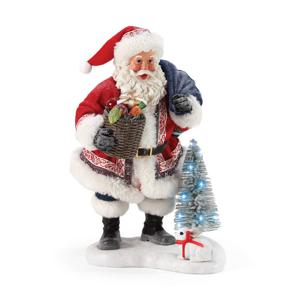 Santa brings thoughtful gifts to everyone! This Santa farm bounty basket for someone who is into healthy eating! Good going! This Clothtique fabric and fur Santa has lots of embroidered trim detail. He stands on a snowy base with a lit tree.
