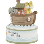 • Sailing atop the ocean waves, the animals within Noah’s ark share sweet faces that let every child know they are loved. Two by two, they offer a sweet sentiment “Overflowing with Love”, and a tune to encourage gentle dreams.
