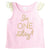 2-piece set. Bamboo-blend racerback tank features ivory mesh flutter sleeves with gold glitter dot print & metallic gold linen "I'm ONE today!" applique. Arrives with mesh tutu with coordinating gold glitter dot print and elastic waistband.