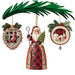 Santa Claus takes on a cozy and rustic appearance with his buffalo plaid gown in this beautifully crafted ornament. The bold red and black checkered design is not only festive but also reminiscent of winter warmth and holiday tradition. His holly-framed cloak adds a pop of green, perfectly complementing his classic look. In one hand, Santa holds a miniature Christmas tree, in the other, he carries a shepherd’s hook adorned with mistletoe.