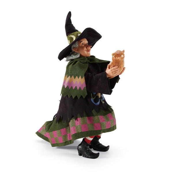 This friendly looking Jim Shore witch has an owl for a pet who is as wise and she is crafty. The fabric skirt and cape both feature Jim's art. This Clothique Possible Dreams design includes the signaure brass tag.