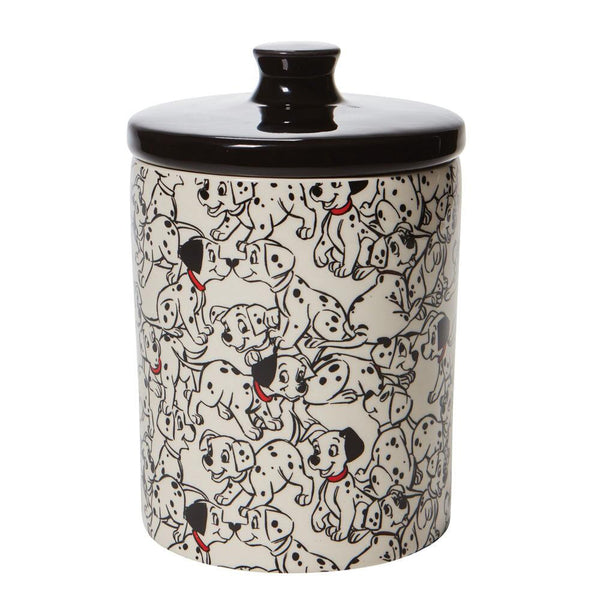 Celebrate the 60th Anniversary of Disney's 101 Dalmatians with this food safe and sturdy stoneware ceramic canister perfect for pet and human treats alike. Decorated with little dalmatian puppies all around the canister.