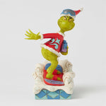 Add a dash of playful mischief to your holiday décor with the Grinch Snowboarding Figurine by Jim Shore. In this dynamic and festive design, The Grinch zooms down the slopes, effortlessly stealing Christmas with a sassy grin. Sporting stylish goggles and his signature Santa disguise, he carves through the snow with presents in tow, bringing a whole new meaning to "dashing through the snow!" From Country N More Gifts