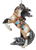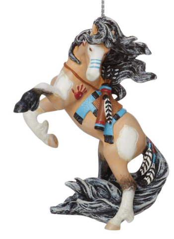 This impressive horse captivates with color and dignity. Rearing in the wind, her billowing black and white mane beguiles. With traditional native American war paint and a colorful saddle, this hanging ornament enchants with indigenous intrigue.