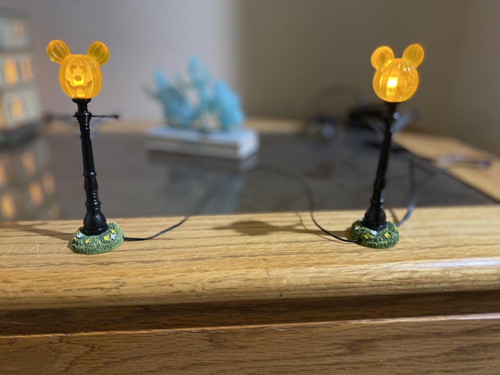Main Street USA is decorated for Halloween with brightly lit Mickey pumpkin lights. There are spooky cobwebs hanging from each light pole. These lampposts can lit using AA batteries or converted to AC using 56.55026 adapters or 56.53500.