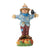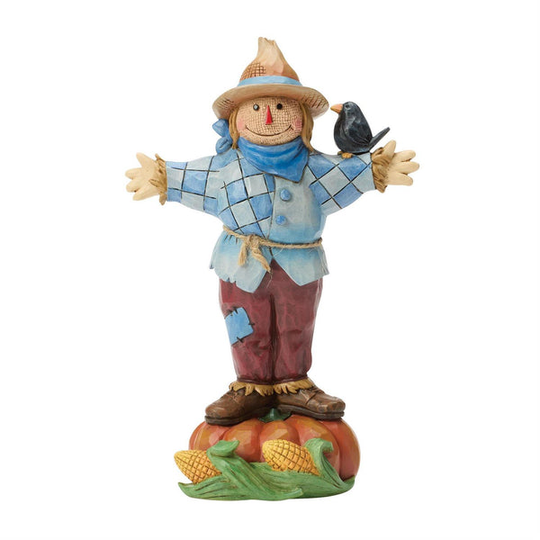 This cheerful Jim Shore scarecrow stands tall on a pumpkin, guarding golden corn with a friendly smile. Dressed in patchwork hand-me-downs and a straw hat, he shares his post with a peaceful crow perched at his side.