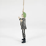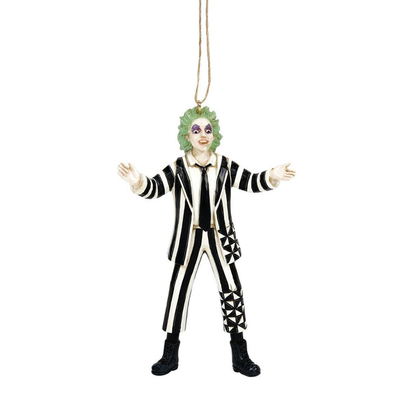 Embrace the Mischievous Charm of Beetlejuice: Bring the mischievous spirit of Beetlejuice to your holiday decor with this festive Christmas ornament by Jim Shore. Featuring Beetlejuice in his iconic black and white striped suit, classic grin, and disheveled green hair, this ornament captures the essence of the beloved character.
