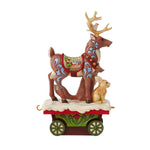 This Jim Shore train car brings friends in tow! A regal reindeer wears a collar of bells and a saddle with a detailed scene of an elf building Christmas toys. A dove rests in the reindeer's antlers, while smaller colorful creatures hitch a ride below.