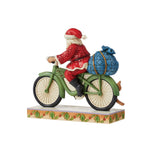 Santa gives his reindeer a break for local deliveries. Making present runs by bicycle, Santa pedals alongside a cheery dog in his red rosemaled suit, presents in tow. His festive green bike is outfitted with holly and Christmas magic.