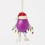 Add playful charm and festive fun to your holiday décor with the M&M'S Purple Character Ornament, a whimsical Jim Shore collectible, available exclusively at CountryNMoreGifts.com. This delightful ornament features M&M'S Purple playfully tangled in a string of holiday lights, wearing a classic Santa hat and flashing a cheerful smile with raised eyebrows. With vibrant colors and Jim Shore’s signature folk-art detailing, this piece brings brightness and personality to any Christmas tree.