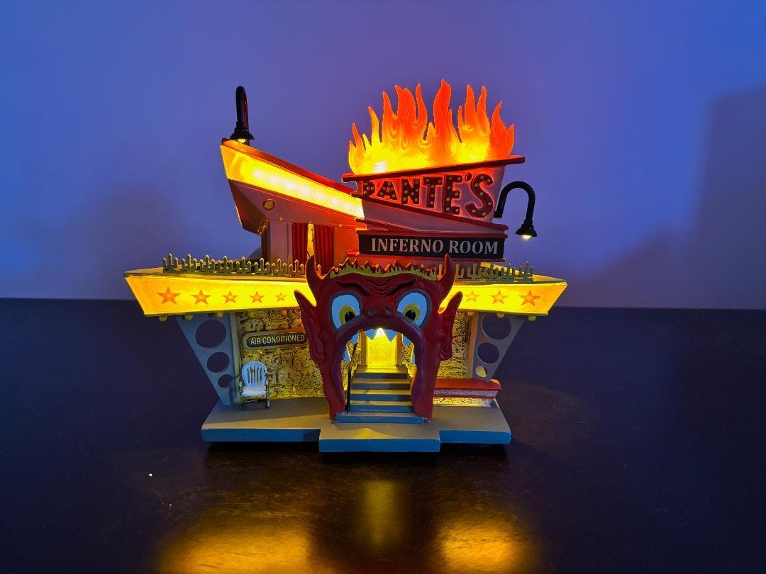 Yes, Dept 56 has done it again. Dante's Inferno Lounge, Beetlejuice's favorite hang out, recreated for Halloween enthusiasts, features a flickering flame and bright lights around the whole building. This ceramic building has Satan's face as the entryway to the club. Paired it with the "Say it Three Times" figurine, this set is a must have for Beetlejuice fans.