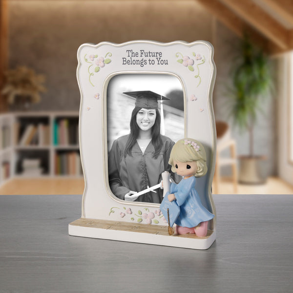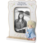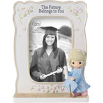 Celebrate hard work, success, and new beginnings with the The Future Belongs to You Photo Frame, a stunning Precious Moments collectible, available at CountryNMoreGifts.com. Featuring a proud graduate standing at the base of the frame, cap and diploma in hand, this keepsake is a beautiful way to display a cherished 4” x 6” graduation photo.