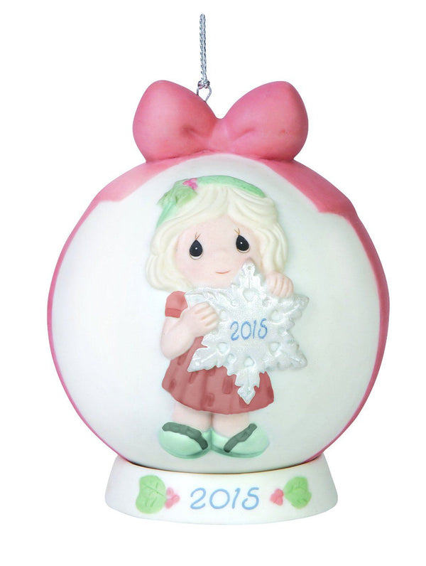 Display this exquisite bisque ball ornament every day of the year! the image of the precious moments girl holding a dated snowflake is sculpted in bas relief on one side; the date and message are inscribed on the reverse side