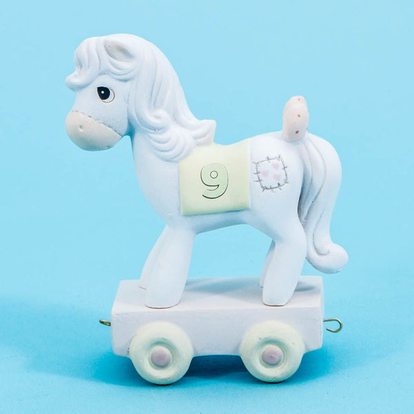 his age 9 addition to the Birthday Train series has a little pony with a bow on his tail and a saddle blanket with the number nine on it. There are hooks on each end of the car so that it may be attached to the other train cars. 4.25 inches tall.