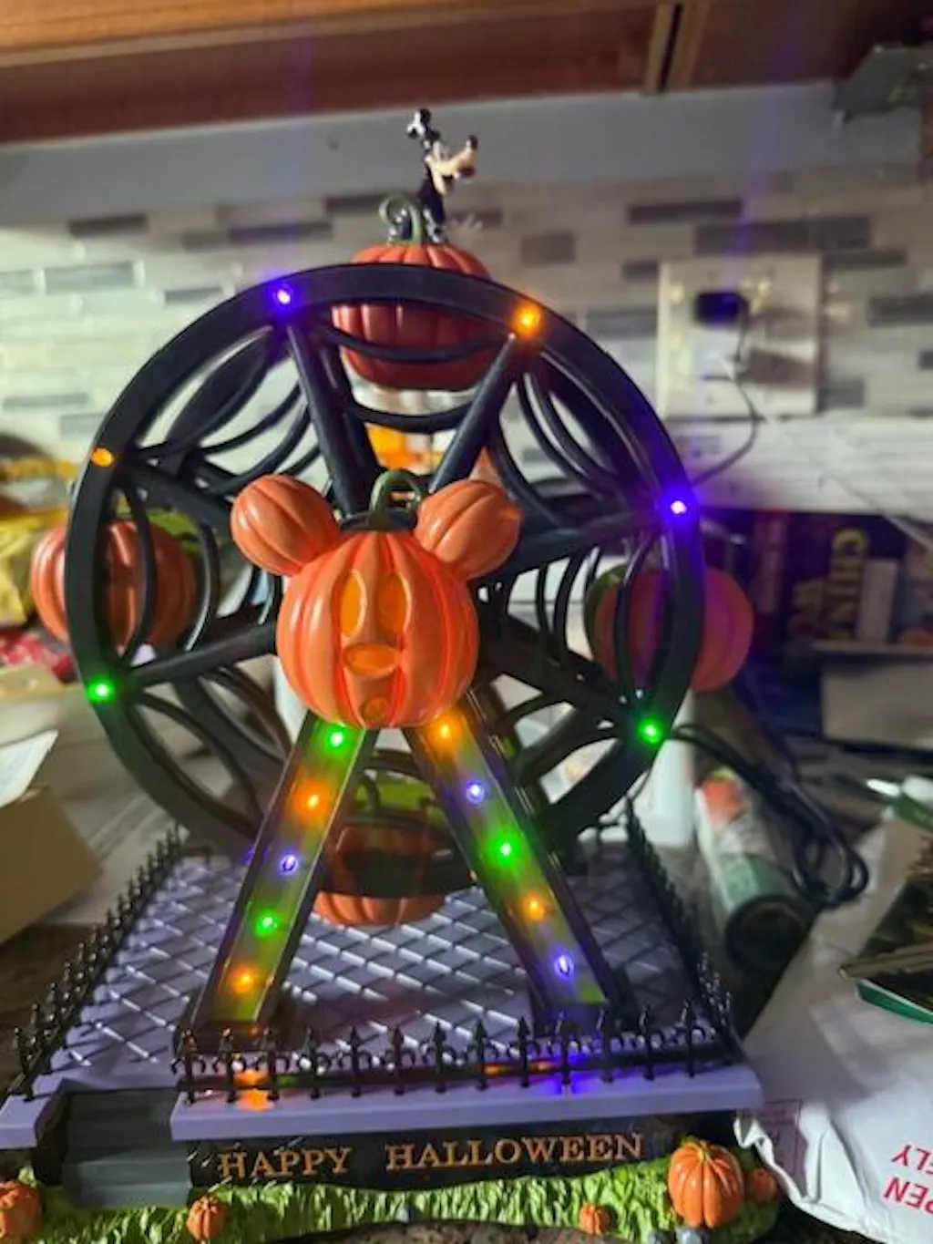 Step into the whimsical world of Pumpkintown with Gawrsh Darn Fun by Department 56. Goofy, with his signature charm, enjoys the thrill of the Ferris Wheel, embodying the playful spirit of Halloween. Whether he’s first on or last off, one thing’s for sure—Goofy is having a blast! Designed for Disney fans and Halloween enthusiasts alike, this figurine is perfect for adding a touch of humor and festive charm to your holiday decor. Pair it with other Pumpkintown pieces for a spooktacular scene. From CountryNMoreGifts.com.