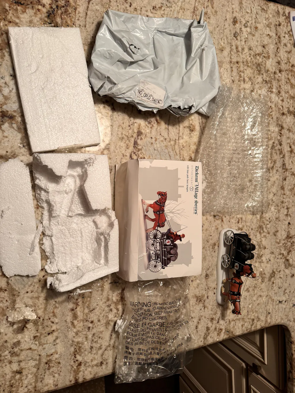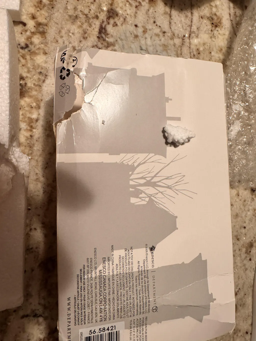 Item arrived destroyed. Department 56 uses a soft styrofoam at times and this is not hold up in shipments. Sleeve was torn. Styrofoam destroyed. The actual piece had minor damage. But, who wants to be treated like this? I was told they ship items like this often with success. Country N More did offer me a 40% discount or to return the item at their costs which I appreciate. I still feel with an item like this, it needs shipped in a box, not a plastic bag. This was the first time I ever received a package like this from them and hope it's the last! I have purchased from them for years.