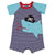 Printed cotton interlock shortall features contrasting sleeves, ribbed neckline binding, inner leg snap closure and cotton interlock and felt shark applique with embroidery and heavy topstitch detail.