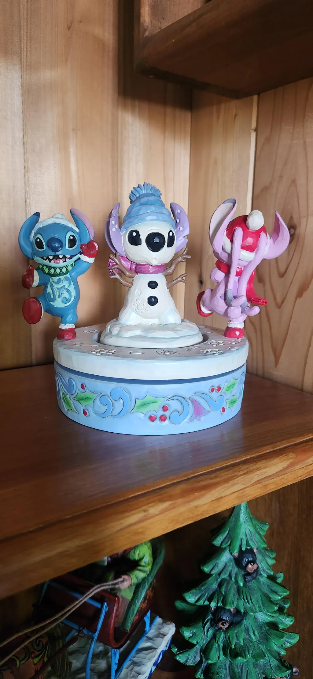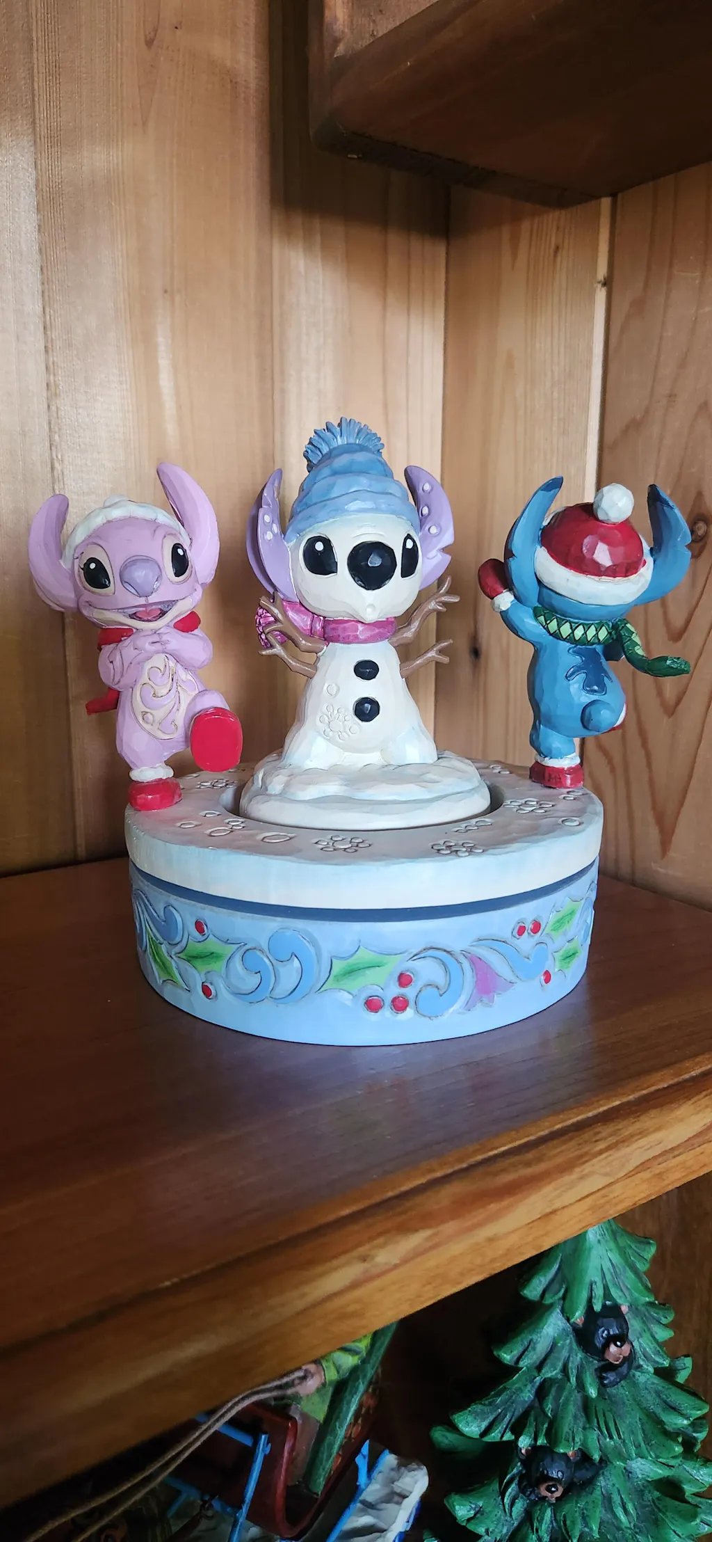 This rotating holiday creation by Jim Shore features Disney's most beloved alien, Stitch and his love interest, Angel. Having just built an inspired snowman, the pair dash around their new creation with mittens, Santa hats, scarves, and smiles.