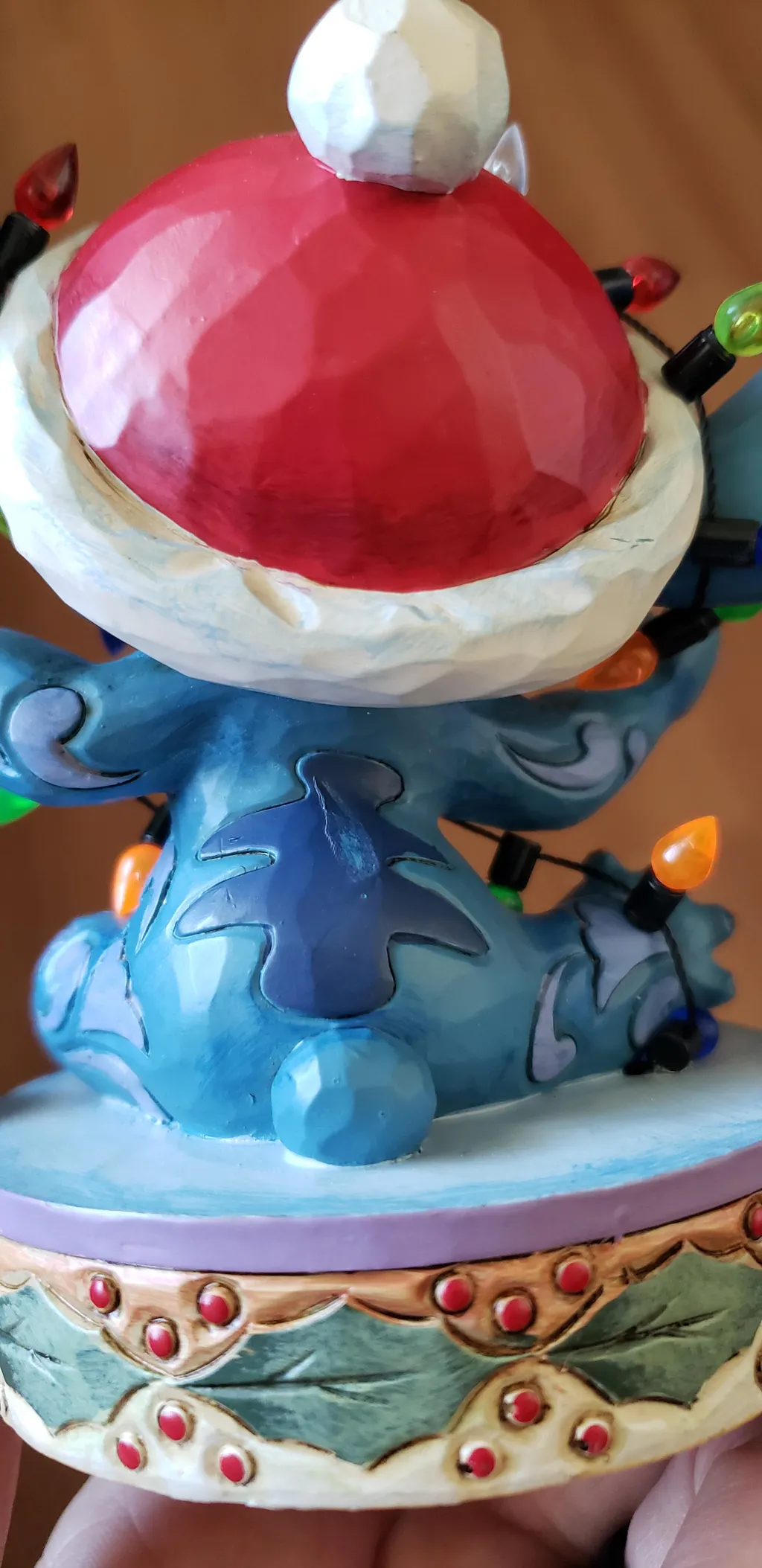 Disney comes home for the holidays with this festive figurine by Jim Shore. Attempting to help his Ohana decorate, Stitch gets caught up in Christmas preparations. Tangled in lights, the little alien tries to escape while wearing a Santa hat.